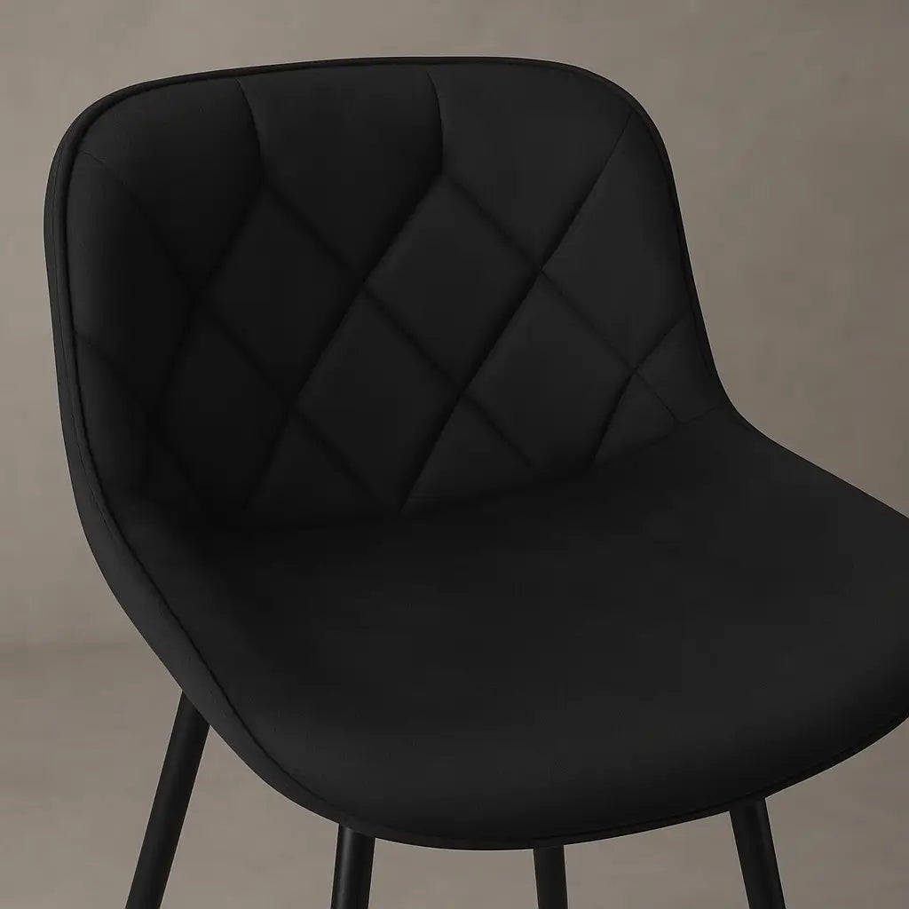 Son mélange de velours matelassé, de métal noir mat et de lignes épurées crée une ambiance moderne chaleureuse, idéale pour la cuisine, le bar, l’îlot central ou une salle à manger élégante.
