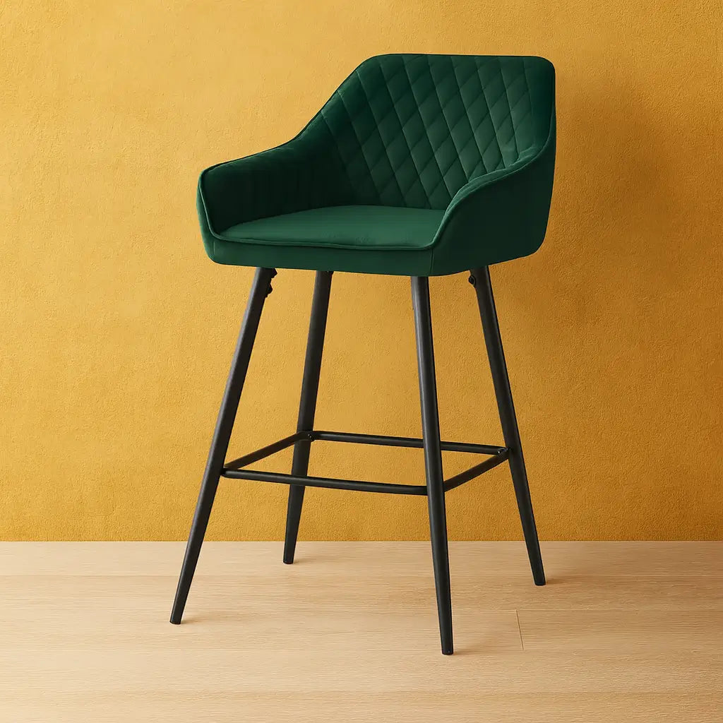 Ce tabouret allie design contemporain et confort raffiné. Sa silhouette élancée, portée par des pieds en métal noir mat, s’impose avec légèreté dans tous les intérieurs. Le contraste entre le vert profond du velours et le fond chaleureux crée une ambiance chic et accueillante, idéale pour un bar ou une cuisine ouverte.