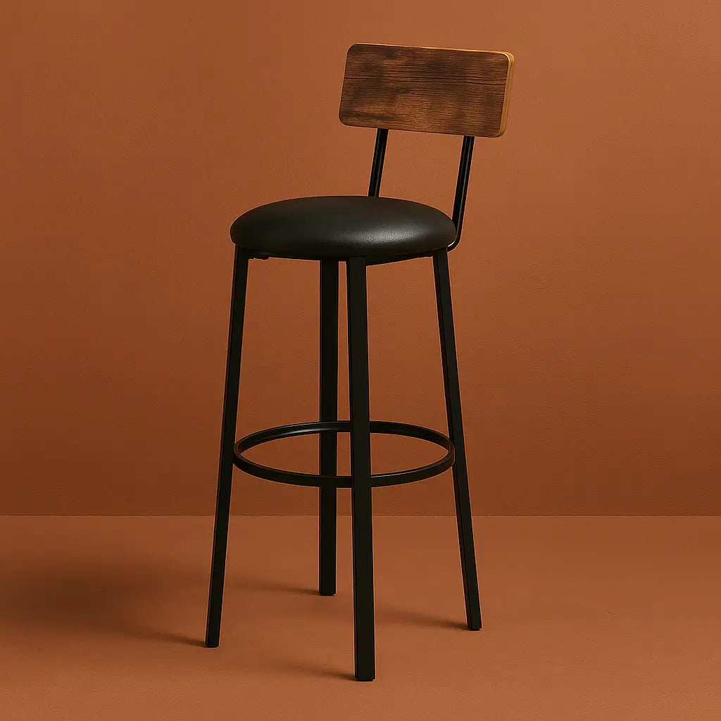 Lot de 2 - Tabourets de bar en bois et cuir pour apporter style industriel et chaleur à votre intérieur. Parfaits pour une cuisine, un îlot ou un espace bar moderne. Assise en cuir PU rembourré, dossier incurvé en bois et structure en acier pour un confort durable et une excellente stabilité.