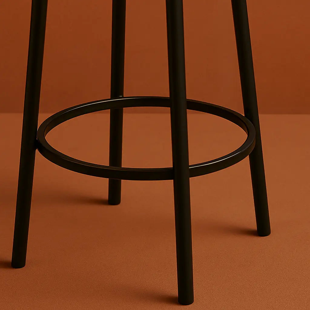 Le zoom sur l’anneau repose-pieds met en valeur un détail ergonomique essentiel : une stabilité renforcée et un confort supplémentaire pour les jambes. Solidement soudé aux quatre pieds, l’anneau permet une posture naturelle et détendue, même lors d’une utilisation prolongée. Cette conception pratique optimise l’expérience d’utilisation sans compromettre le style minimaliste du tabouret.