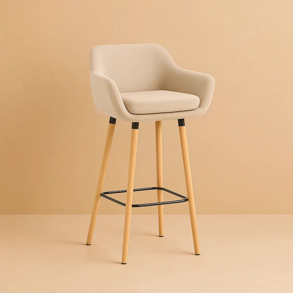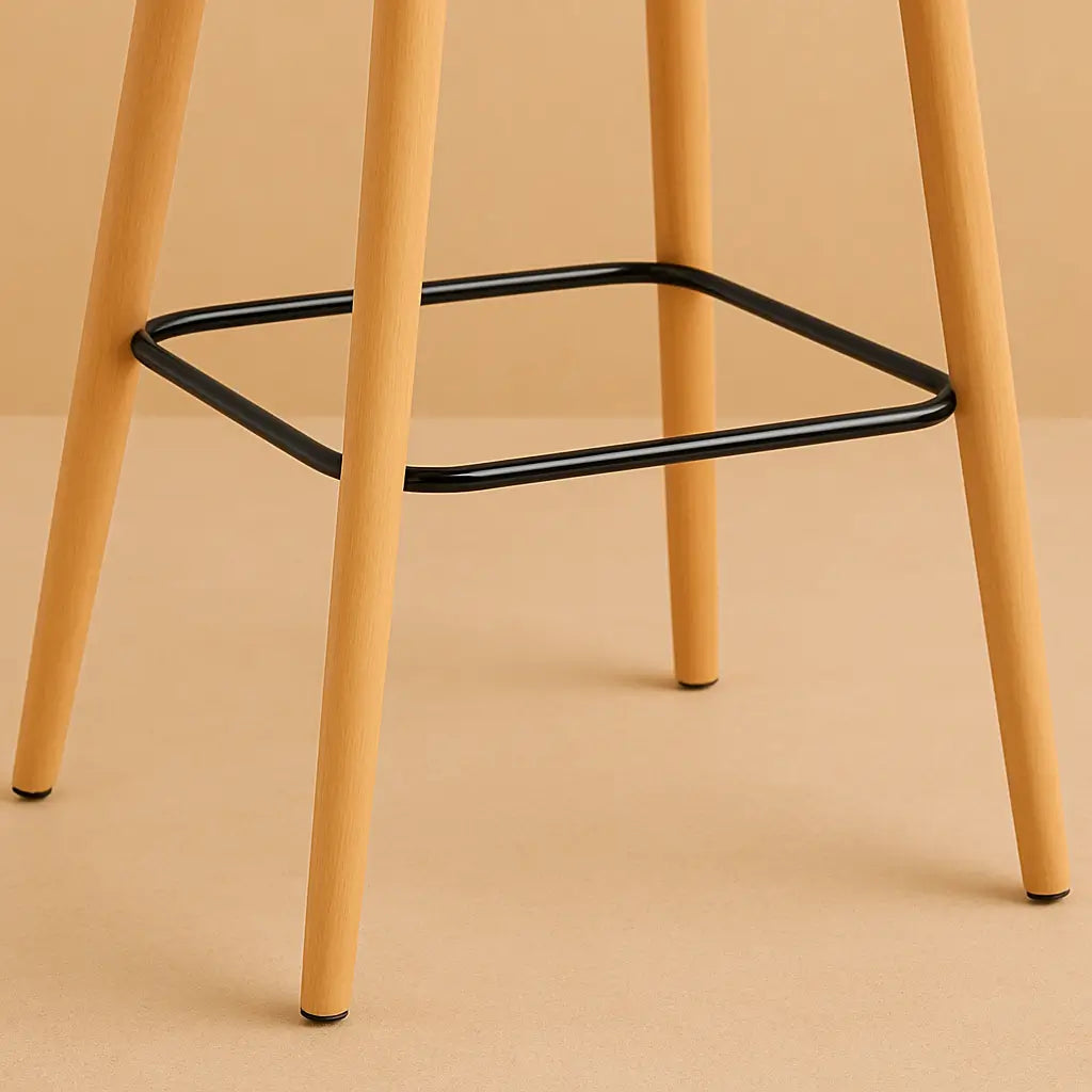 Le repose-pieds en métal noir, subtilement intégré, confère au tabouret une allure moderne et assure une posture confortable. Sa structure robuste, associée aux pieds en bois clair, crée un contraste harmonieux entre solidité et élégance, tout en apportant une sensation de stabilité et de légèreté visuelle.