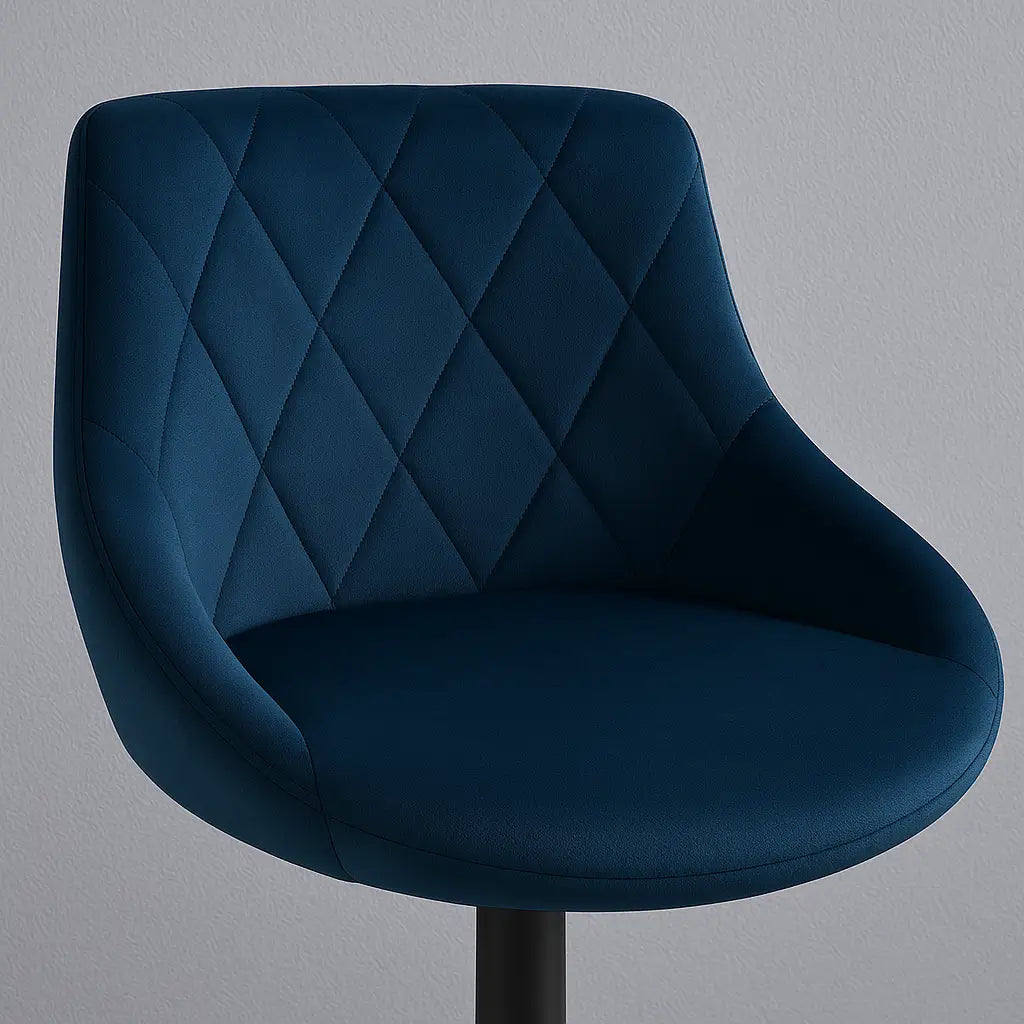 L’assise et le dossier du tabouret révèlent un confort exceptionnel allié à une élégance raffinée. Le tissu velouté bleu profond, associé au capitonnage en losanges, apporte une touche de sophistication tout en assurant un soutien ergonomique. La forme enveloppante épouse naturellement le dos, offrant une assise à la fois chic et agréable pour de longs moments de détente ou de travail.